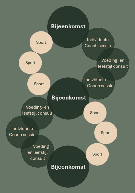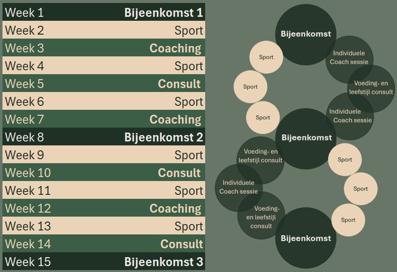 Tijdens de drie groepsbijeenkomsten staat voornamelijk het delen van kennis op de agenda. We delen onze visie op gezondheid en stress, tevens hoort hier spycho-educatie bij. Daarnaast bieden we uiteenlopend werkvormen aan, van systemische opstellingen, ademwerk, stress release, tot een lesje yoga. Tussen de groepsbijeenkomsten door volgen de deelnemers om de week een blok sport in subgroepen. Het individuele programma bestaat enerzijds uit drie consulten naar aanleiding van bloedonderzoek, waarbij voedingsadvies en eventueel suppletie wordt ingezet. Daarnaast volgt men een coachtraject voor het vergroten van mentale draag- en veerkracht. Iedere week staat een onderdeel op de planning.